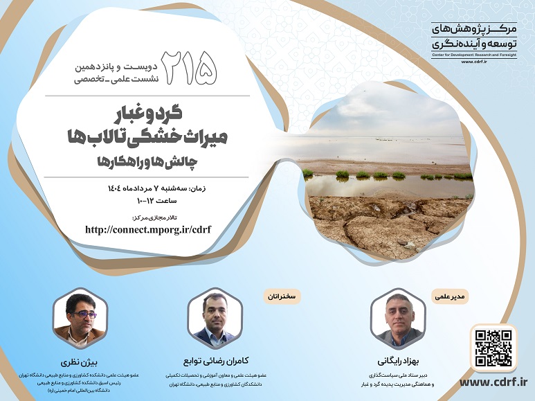 مرکز پژوهش های توسعه و آینده نگری، دویست و پانزدهمین نشست علمی - تخصصی " گرد وغبار ،میراث خشکی تالاب ها:چالش ها وراهکارها " را برگزار می نماید.